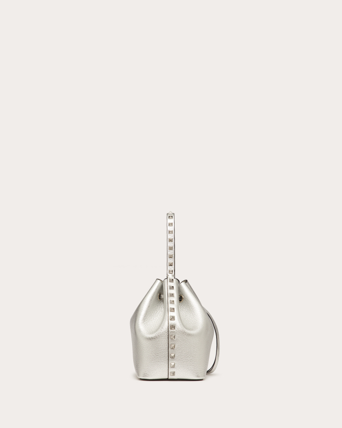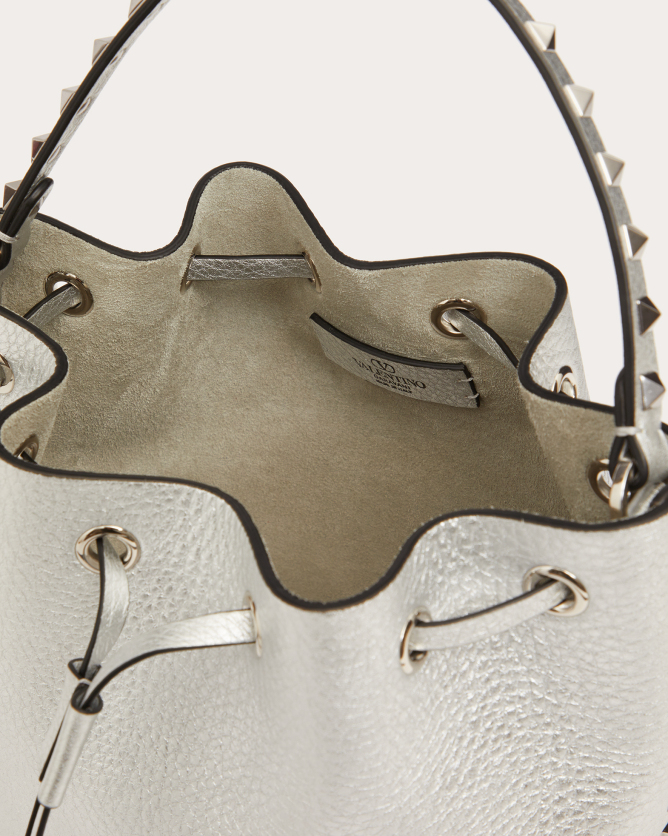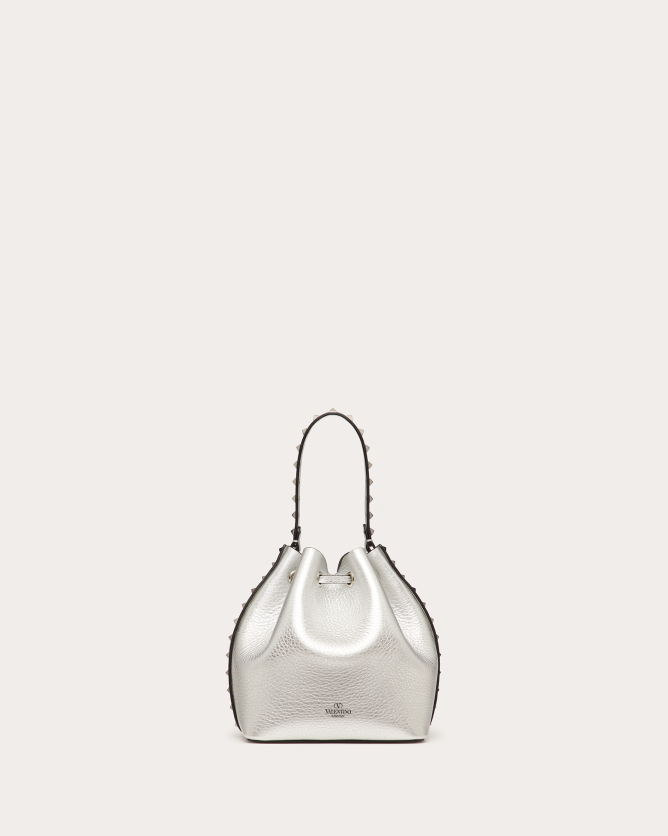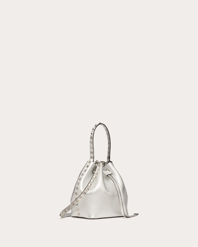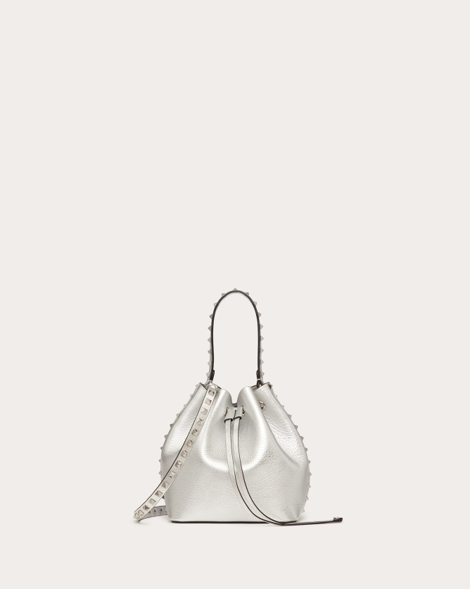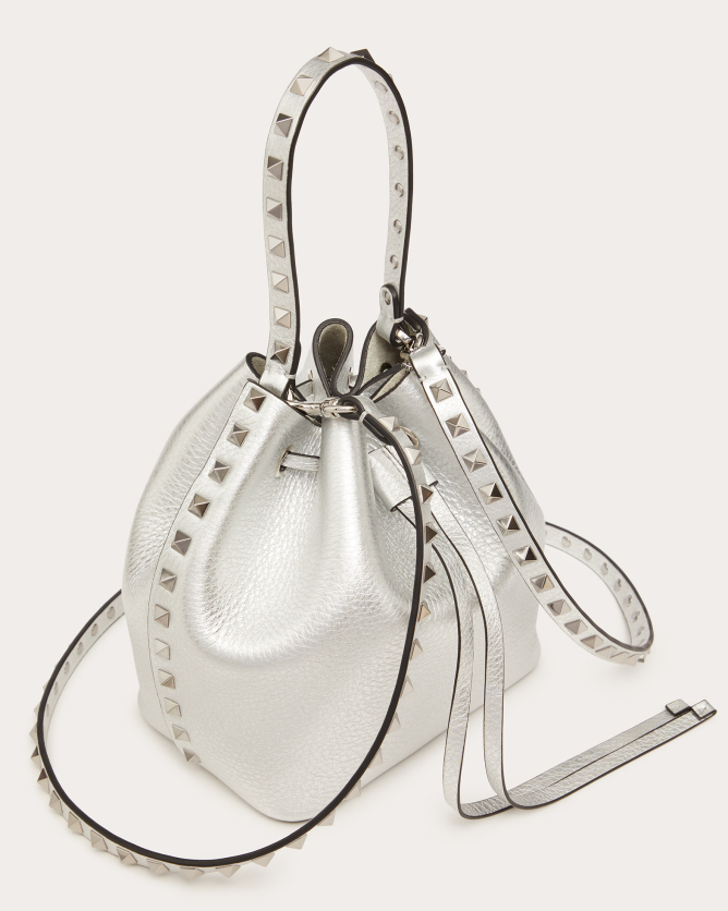 The Valentino Garavani Rockstud grained metallic calfskin bucket bag is a refined accessory that combines luxury with versatility. Crafted in Italy from premium grained metallic calfskin leather, it features the brand’s signature Rockstud detailing, adding a touch of edgy sophistication. The bag offers multiple carrying options with its adjustable shoulder strap and top handle, allowing it to be worn as a shoulder bag or carried by hand. Its interior includes a slip pocket for organization, and the drawstring closure ensures your belongings are secure.