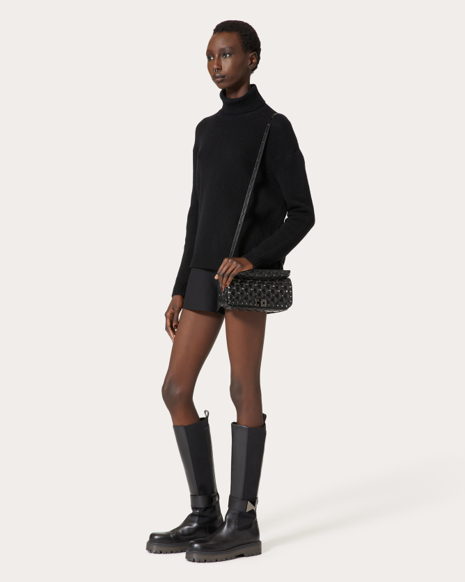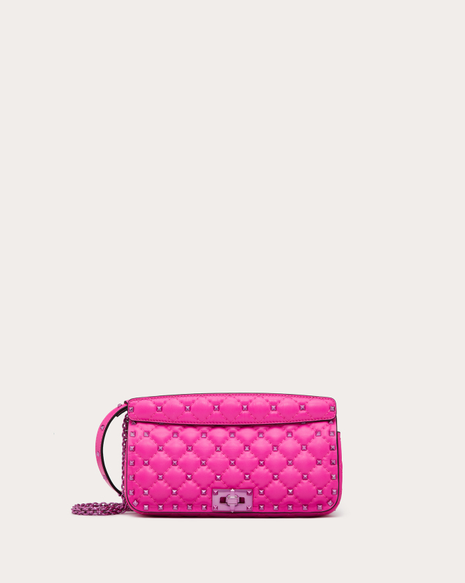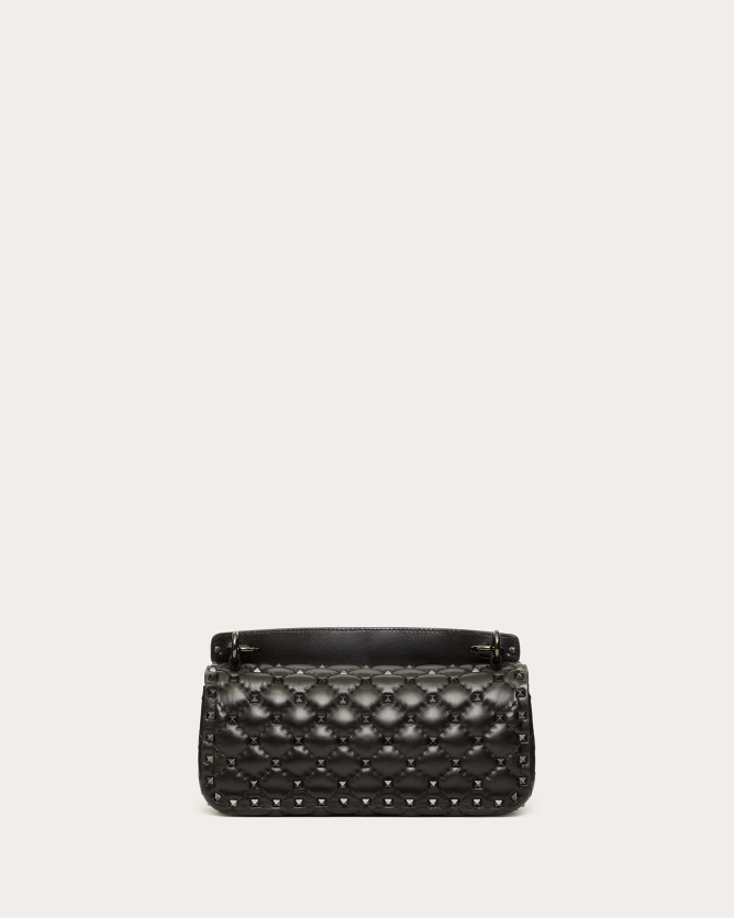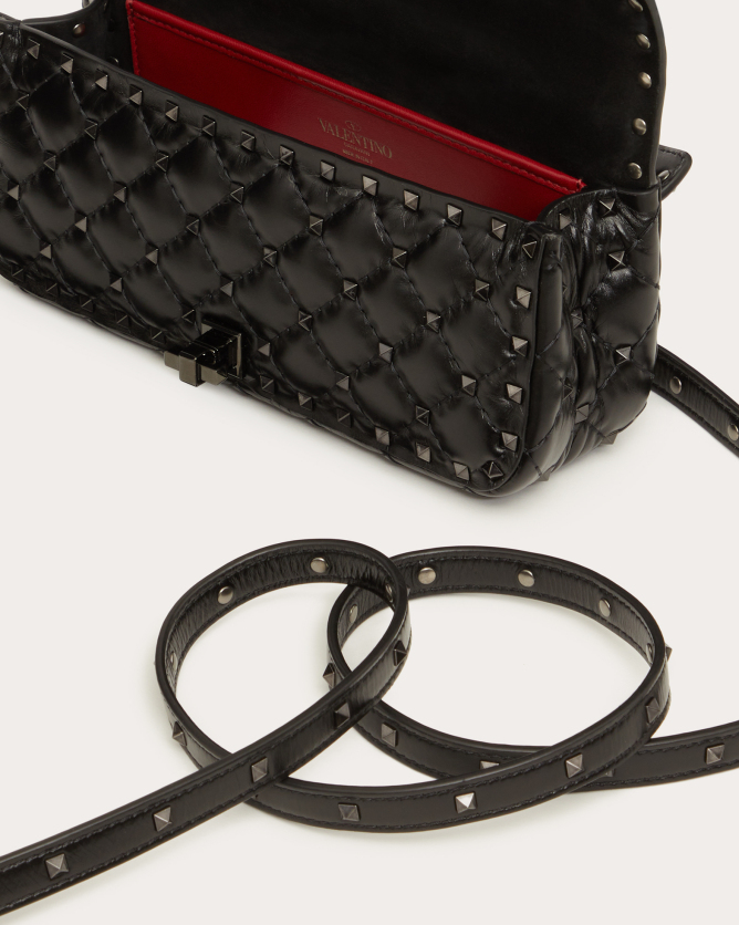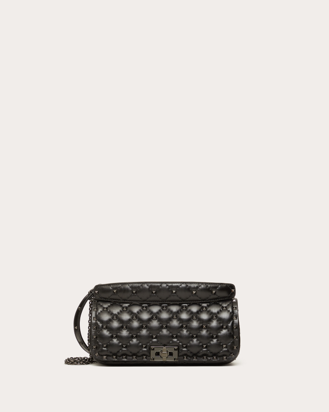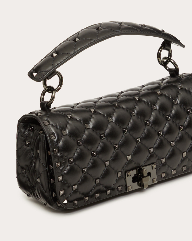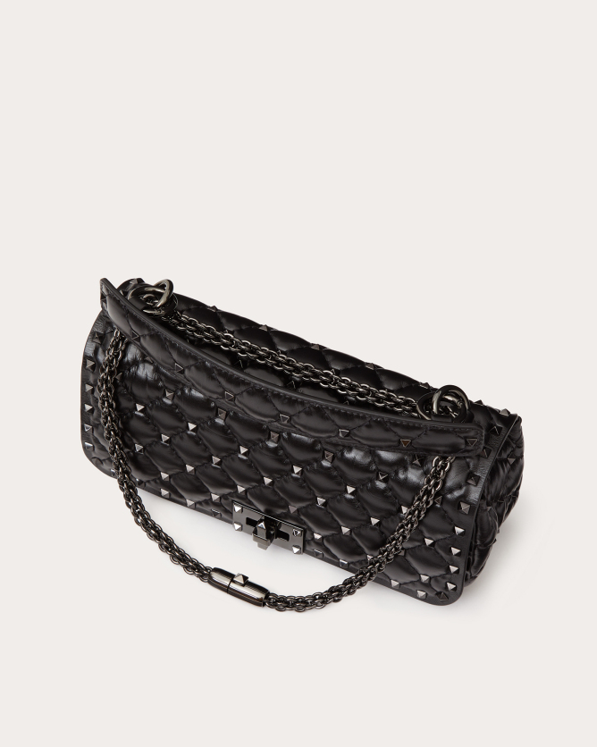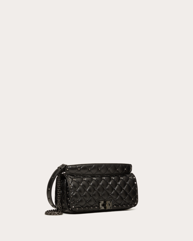 The Valentino Garavani Rockstud Spike calfskin handbag is a luxurious accessory that combines elegance with versatility. Crafted in Italy from quilted calfskin leather, it features a diamond-patterned design adorned with platinum-finish metal studs. The bag offers multiple carrying options with its detachable sliding chain strap and removable handle, allowing it to be worn as a crossbody, shoulder bag, or carried by hand. Its flap with twist-lock closure secures a nappa leather-lined interior equipped with a zippered pocket for organization.