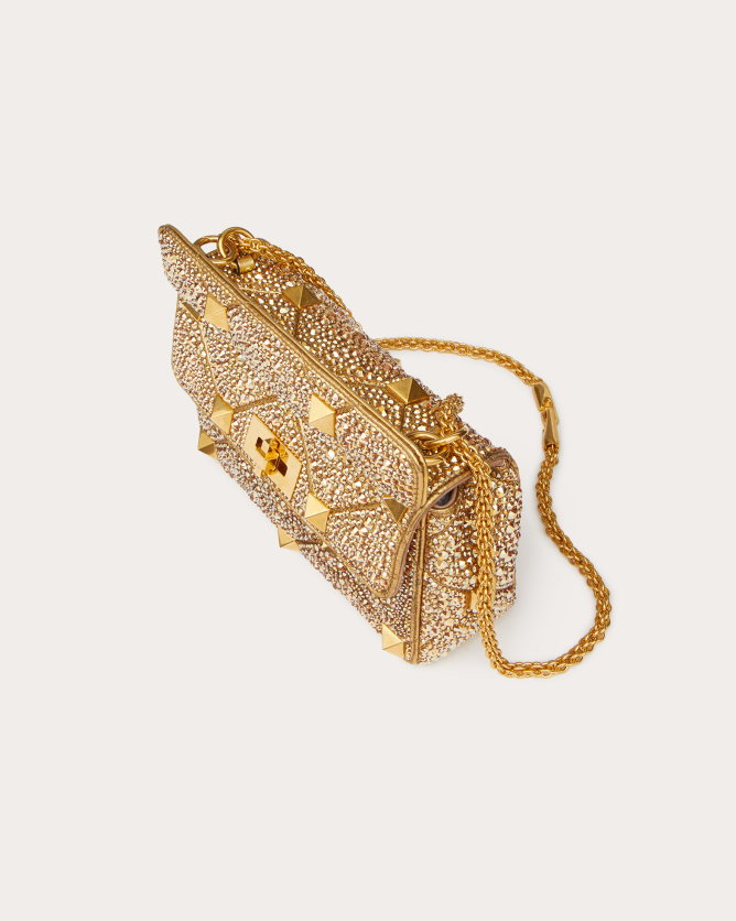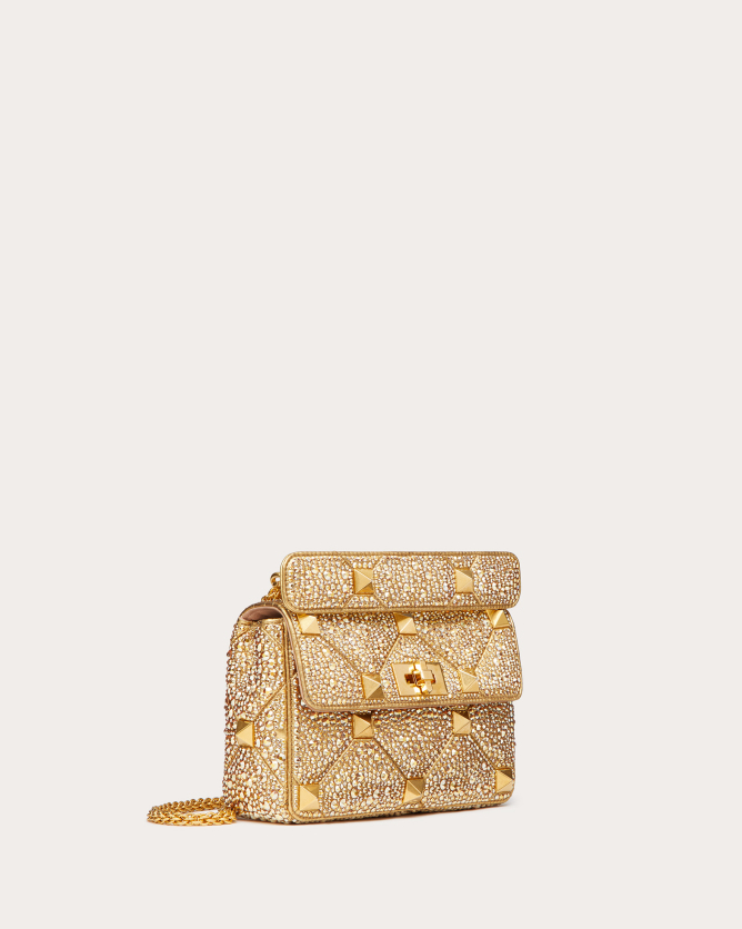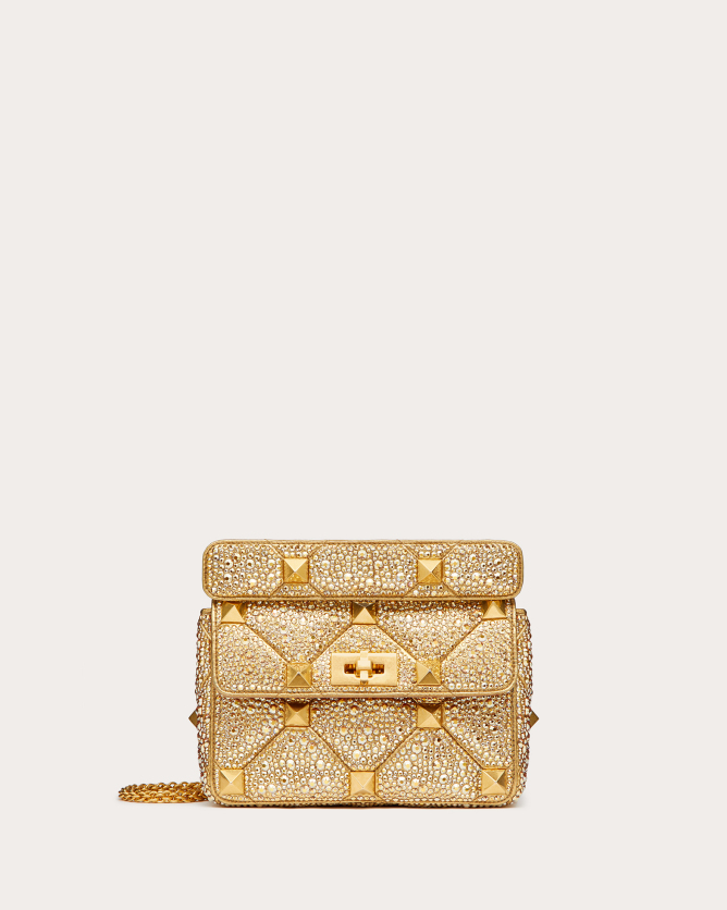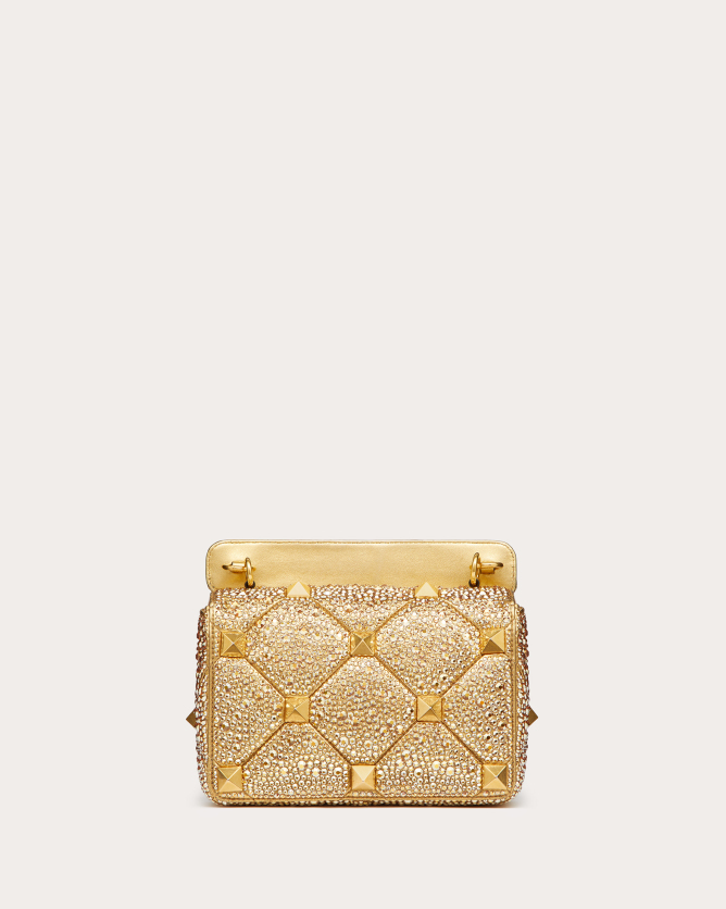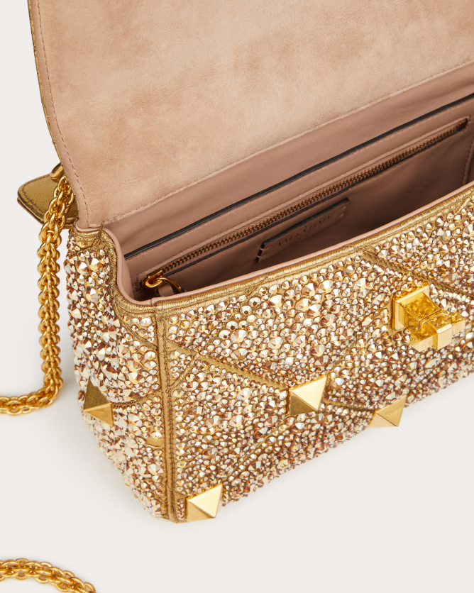 The Valentino Garavani Roman Stud Medium Shoulder Bag with rhinestone embroidery is a luxurious accessory that combines elegance with versatility. Crafted in Italy from nappa lambskin, it features a diamond-quilted design adorned with tone-on-tone stitching and oversized Roman Studs in antique brass. The bag offers multiple carrying options with its detachable sliding chain strap and removable handle, allowing it to be worn as a crossbody, shoulder bag, or carried by hand. Its interior includes a zip pocket and two flat open pockets for organization. The turn-lock closure secures your belongings, making this bag both stylish and functional.