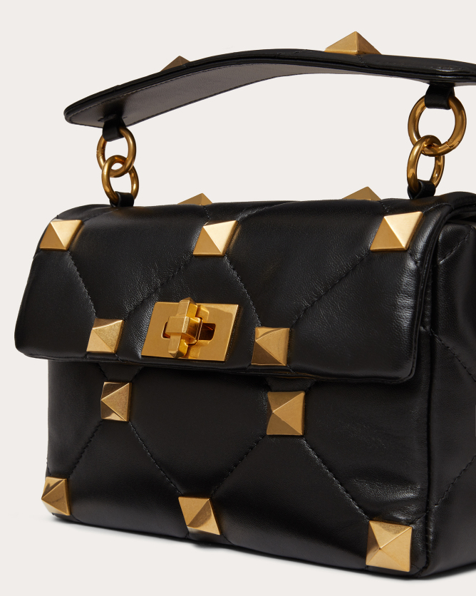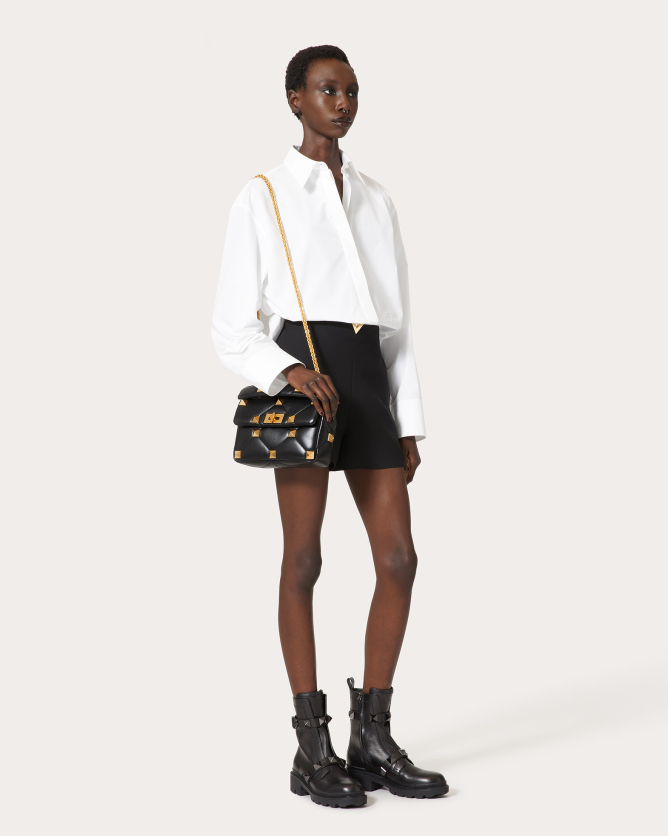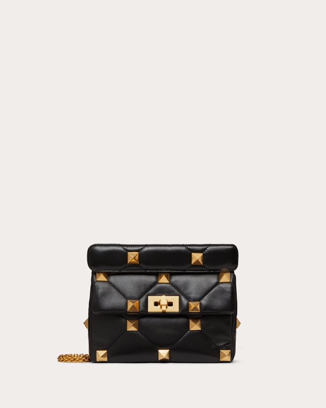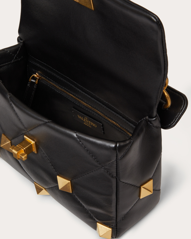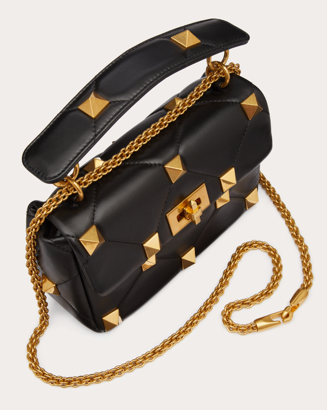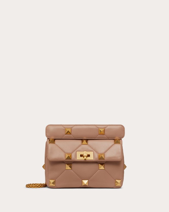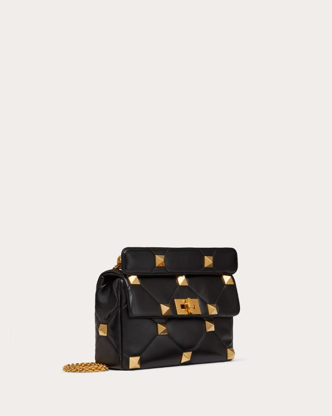 The Valentino Garavani Roman Stud Medium Lambskin Chain Shoulder Bag is a luxurious accessory that combines elegance with versatility. Crafted in Italy from soft lambskin nappa leather, it features a diamond-quilted design adorned with oversized Roman Studs in antique brass. The bag offers multiple carrying options with its detachable sliding chain strap and removable handle, allowing it to be worn as a crossbody, shoulder bag, or carried by hand. Its interior includes a zip pocket and two flat open pockets for organization. The turn-lock closure secures your belongings, making this bag both stylish and functional.