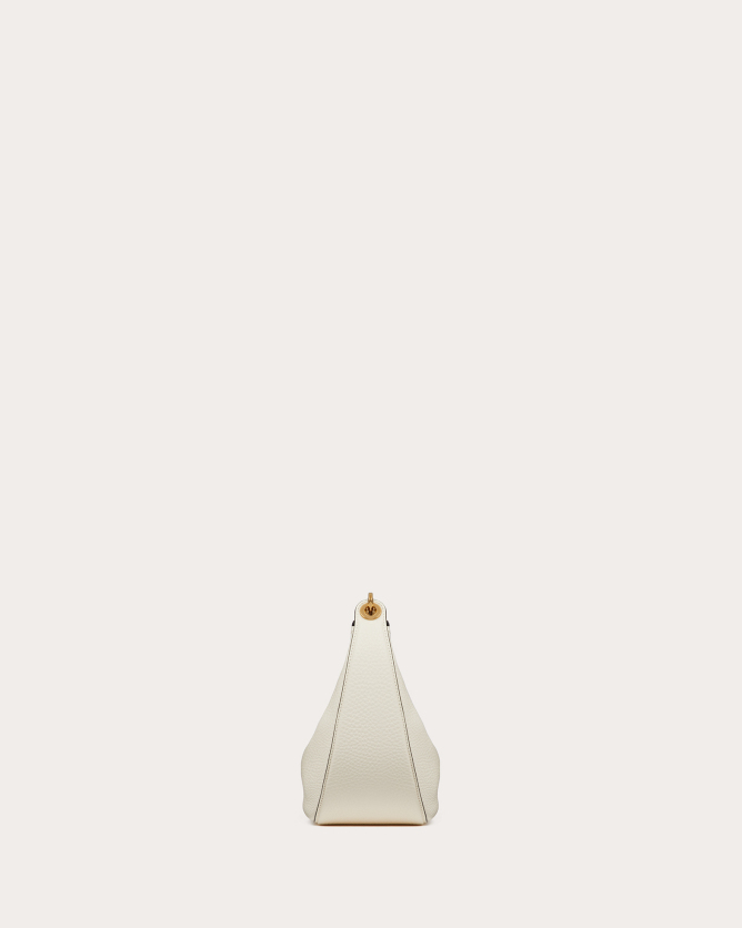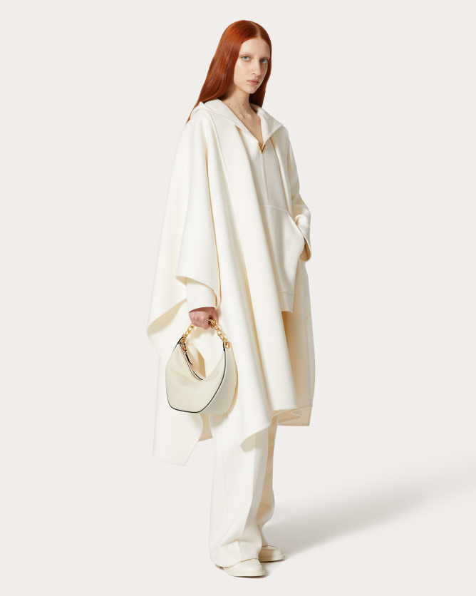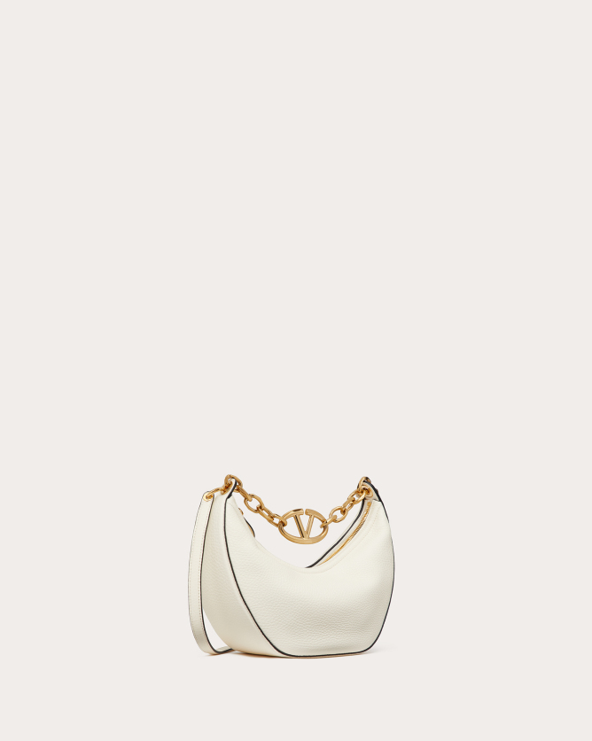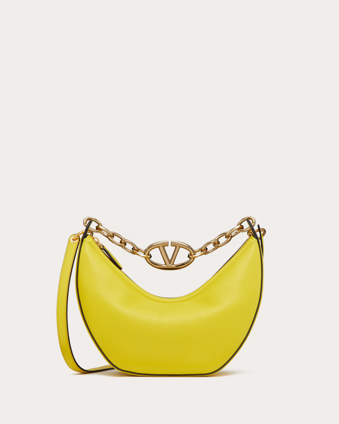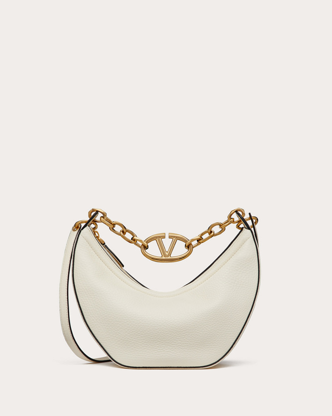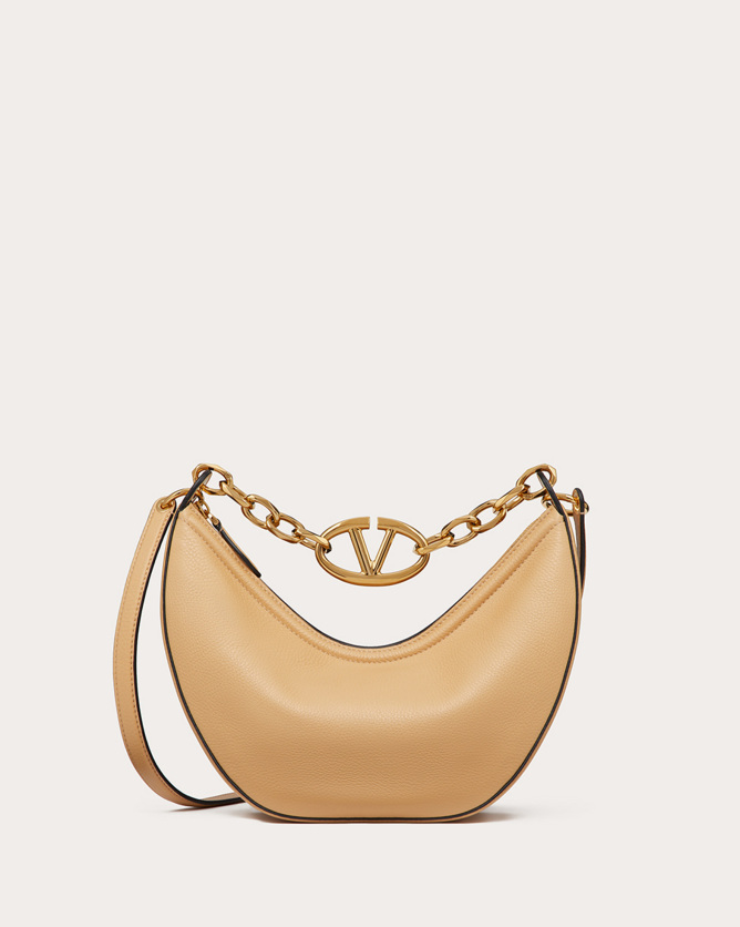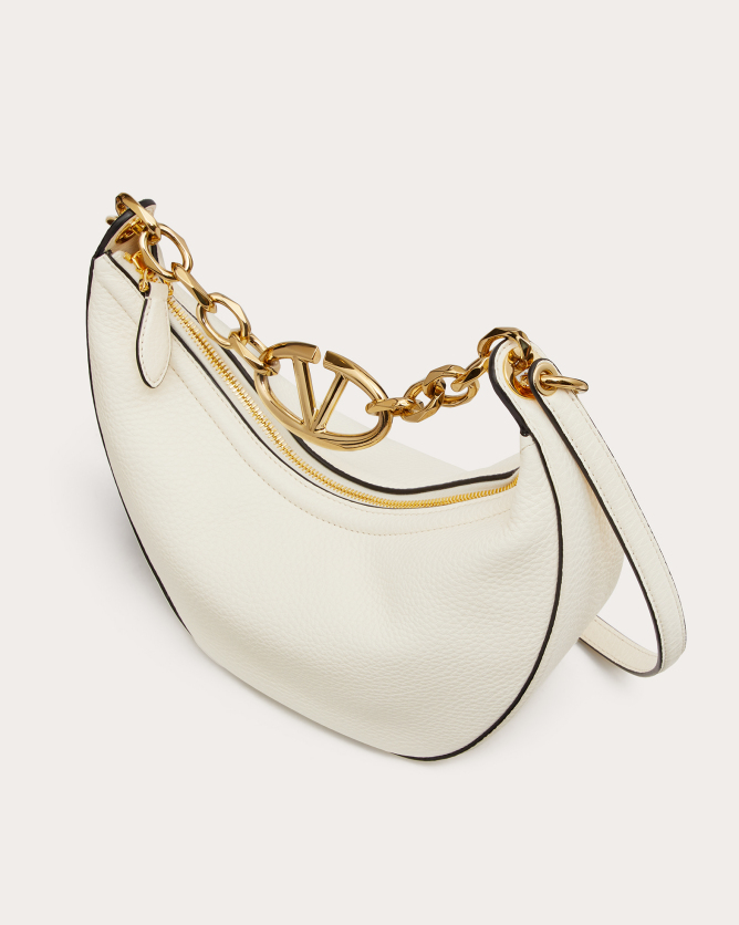 The Valentino Garavani VLogo Moon Small Chain Leather Bag is a refined accessory that combines luxury with versatility. Crafted in Italy from grainy calfskin leather, it features a metallic VLogo Signature detail and gold-tone finish chain and hardware. The bag offers multiple carrying options with its removable leather shoulder strap and chain handle, allowing it to be worn as a crossbody, shoulder bag, or carried by hand. Its zipper closure secures a nappa leather-lined interior equipped with a slip pocket for organization.